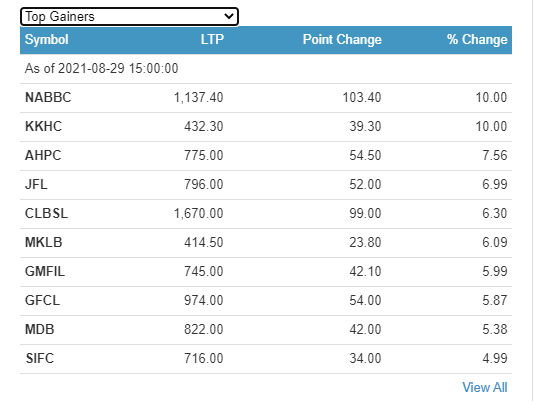 आज सबैभन्दा धेरै नारायणी डेभलपमेन्ट बैंक र खानीखोला हाइड्रोपावर कम्पनीका लगानीकर्ताले कमाएका छन् । कम्पनीका लगानीकर्ताले १० प्रतिशतका दरले कमाएका छन् । अरुण भ्याली हाइड्रोपावर कम्पनीका लगानीकर्ताले ७ दशमलव ५६ प्रतिशतका दरले कमाएका छन् ।