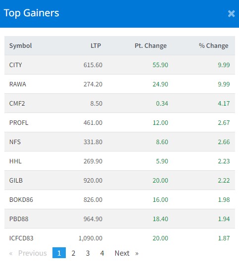 यसैगरी आज रावा इनर्जी डेभलपमेन्ट लिमिटेडको शेयर ९.९९ प्रतिशतले बृद्धि हुँदा यो कम्पनीक लगानीकर्ताले सर्वाधिक कमाएका छन् । आज कम्पनीको प्रति शेयर मूल्य भने २७४ रुपैयाँ कायम भएको छ । साथै, सिटिजन म्युचुअल फन्ड ४.१७ प्रतिशतले बृद्धि हुँदा प्रति इकाई मूल्य ८ रुपैयाँ कायम भएको छ ।