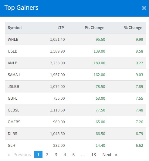 आज सबैभनदा धेरै विन नेपाल लघुवित्तका लगानीकर्ताले कमाएका छन् । आज यस कम्पनीका लगानीकर्ताले ९ दशमलव ९९ प्रतिशतका दरले कमाएका छन् । आज उन्नती सहकार्य लघुवित्तका लगानीकर्ताले ९ दशमलव ५८ प्रशिततका दरले कमाएका छन् । आत्मानिर्भर लघुवित्तका लगानकिर्ताले ९ दश्मलव २२ प्रतिशतका दरले कमाएका छन् ।