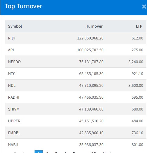 त्यस्तै, नेष्डो समृद्ध लघुवित्त वित्तीय सस्थाको ७ करोड ५१ लाख रुपैयाँको शेयर कारोबार भएको छ । नेपाल टेलिकमको ६ करोड ५४ लाख रुपैयाँको शेयर कारोबार भएको छ । हिमालयन डिष्टिलरीको ४ करोड ७७ लाख रुपैयाँको शेयर कारोबार भएको छ ।