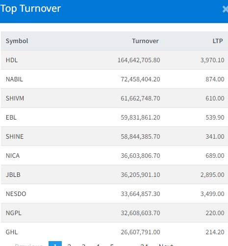 आज नविल बैंकको ७ करोड २४ लाख रुपैयाँको शेयर कारोबार भएको छ । शिवम् सिमेन्टको ६ करोड १६ लाख रुपैयाँको शेयर कारोबार भएको छ । एभरेष्ट बैंकको ५ करोड ९८ लाख रुपैयाँको शेयर कारोबार भएको छ ।