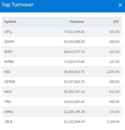 आज सबैभन्दा धेरै युनिभर्सल पावर कम्पनीको शेयर कारोबार भएको छ । आज कम्पनीको ७ करोड ५५ लाख रुपैयाँको शेयर कारोबार भएको छ । शिवम् सिमेन्टको ६ करोड ५० लाख रुपैयाँको शेयर कारोबार भएको छ । सानिमा माई हाइड्रोपावरको ६ करोड ४६ लाख रुपैयाँको शेयर कारोबार भएको छ ।