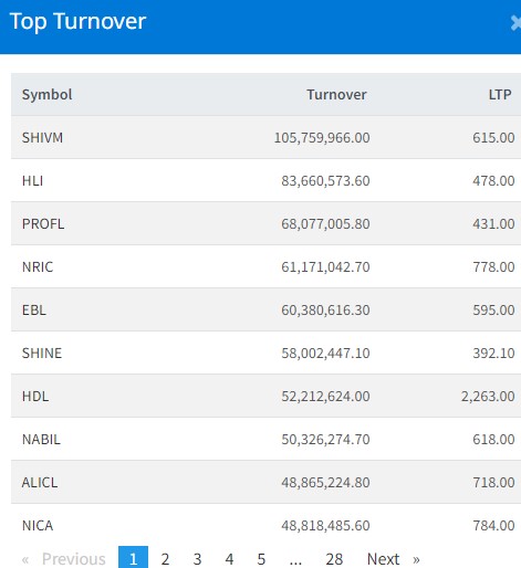 आज २ अर्ब ४२ करोड ५७ लाख रुपैयाँको शेयर कारोबार हुँदा सबैभन्दा धेरै शिवम् सिमेन्टको शेयर कारोबार भएको छ । आज कम्पनीको १० करोड ५७ लाख रुपैयाँको शेयर कारोबार भएको छ । त्यस्तै, आज हिमालयन लाइफको ८ करोड ३६ लाख रुपैयाँको शेयर कारोबार भएको छ । प्रोगैशिभ फाइनान्सको ६ करोड ८० लाख रुपैयाँको शेयर कारोबार भएको छ । नेपाल पुनर्बीमाको ६ करोड ११ लाख रुपैयाँको शेयर कारोबार भएको छ ।