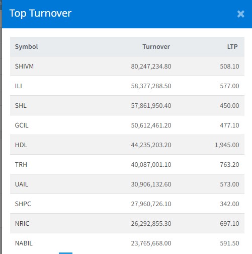 आज १ अर्ब ४० करोड ८९ लाख रुपैयाँको शेयर कारोबार हुँदा सबैभन्दा धेरै शिवम् सिमेन्टको शेयर कारोबार भएको छ । आज कम्पनीको ८ करोड २ लाख रुपैयाँको शेयर कारोबार भएको छ । त्यस्तै, आइएमई लाइफको ५ करोड ८३ लाख रुपैयाँको शेयर कारोबार भएको छ । सोल्टी होटलको ५ करोड ७८ लाख रुपैयाँको शेयर कारोबार भएको छ । घोराही सिमेन्टको ५ करोड ६ लाख रुपैयाँको शेयर कारोबार भएको छ ।