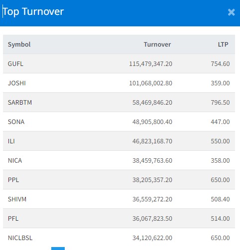 आज दिनभरिमा ३२० कम्पनीको ५६ लाख ५६ हजार २८२ कित्ता शेयर किनबेच हुदा २ अर्ब ५ करोड ८३ लाख रुपैयााको शेयर कारोबार भएको छ । आज सबैभन्दा धेरै गोर्खाज फाइनान्स कम्पनीको शेयर कारोबार भएको छ । आज यस कम्पनीको ११ करोड ५४ लाख रुपैयाँको शेयर कारोबार भएको छ । जोशी हाइड्रोपावर कम्पनीको १० करोड १० लाख रुपैयाँको शेयर कारोबार भएको छ । सर्वोत्तम सिमेन्टको ५ करोड ८४ लाख रुपैयाँको शेयर कारोबार भएको छ ।