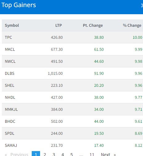 आज सबैभन्दा धेरै तेह्रथुम पावरका लगानीकर्ताले कमाएका छन् । आज यस कम्पनीका लगानीकर्ताले १० प्रतिशतका दरले कमाएका छन् । मुक्तिनाथ कृषि कम्पनीका लगानीकर्ताले ९ दशमलव ९९ प्रतिशतका दरले कमाएका छन् । नेपाल वेयरहाउजीङका लगानीकर्ताले ९ दशलमव ९८ प्रतिशतका दरले कमाएका छन् । धौलागिरी लघुवित्तका लगानीकर्ताले ९ दशलमव ९६ प्रतिशतका दरले कमाएका छन् ।