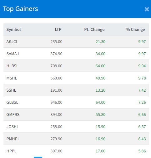 आज सबैभन्दा धेरै आँखु खोला जलविद्युत कम्पनी र समाज लघुवित्त वित्तीय संस्थाका लगानीकर्ताले कमाएका छन् । आज यी दुई कम्पनीका लगानीकर्ताले ९ दशमलव ९७ प्रतिशतका दरले कमाएका छन् । हिमालयन लघुवित्त वित्तीय संस्थाका लगानीकर्ताले ९ दशमलव ९४ प्रतिशतका दरले कमाएका छन् । मिड सोलुका लगानीकर्ताले ९ दशमलव ७८ प्रतिशतका दरले कमाएका छन् ।