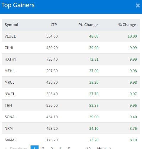 आज सबैभन्दा धेरै भिजन लुम्बिनी उर्जा कम्पनीका लगानीकर्ताले कमाएका छन् । आज यस कम्पनीका लगानीकर्ताले १० प्रतिशतका दरले कमाएका छन् । चिरख्वा हाइड्रोपावर र हाथवे इन्भेष्टमेन्टका लगानीकर्ताले ९ दशलमव ९९ प्रतिशतका दरले कमाएका छन् । मनकामना इन्जिनियरिङका लगानीकर्ताले ९ दशमलव ९८ प्रतिशतका दरले कमाएका छन् ।