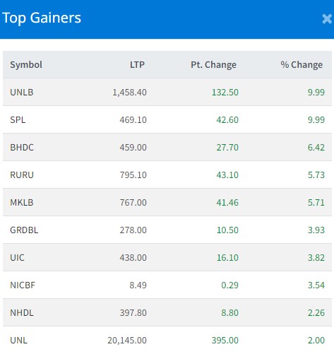 आज सबैभन्दा धेरै यूनिक नेपाल लघुवित्त वित्तीय संस्था र शुभम पावर कम्पनीका लगानीकर्ताले कमाएका छन् । यस कम्पनीका लगानीकर्ताले ९ दशलमव ९९ प्रतिशतका दरले कमाउका छन् । विन्ध्यावासिनी हाइड्रोका लगानकिर्ताले ६ दशलमव ४२ प्रतिशतका दरले कमाएका छन् । रुरु जलविद्युत कम्पनीक ालगानीकर्ताले ५ प्रतिशतका दरले कमाएका छन् ।