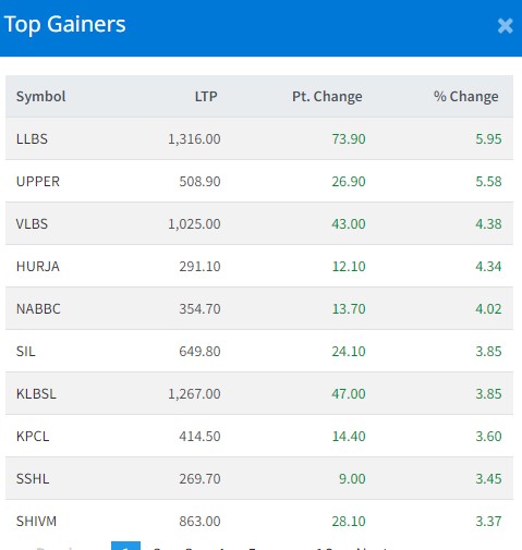 आज सबैभन्दा धेरै लक्ष्मी लघुवित्त वित्तीय संस्थाका लगानीकर्ताले कमाएका छन् । कम्पनीका लगानीकर्ताले ५ दशमलव ९५ प्रतिशतका दरले कमाएका छन् । अपर तामाकोशीका लगानीकर्ताले ५ दशमलव ५८ प्रतिशतका दरले कमाएका छन् । विजय लघुवित्तका लगानीकर्ताले ४ दशमलव ३८ प्रतिशतका दरले कमाएका छन् । हिमालयन उर्जा विकासका लगानीकर्ताले ४ दशमलव ३४ प्रतिशतका दरले कमाएका छन् ।