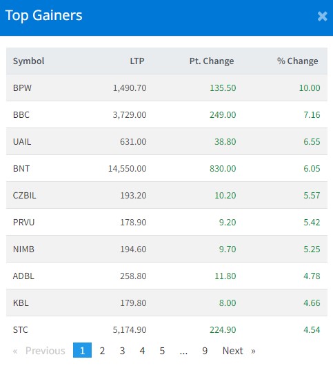 काठमाडौं । आज शेयर बजार नेप्शे परिसूचक ११ दशमलव १७ प्रतिशतले बृद्धि भई २१६५ दशमलव २४ को विन्दुमा कायम भएको छ । आज कुल ३ अर्ब ३४ करोड ८६ लाख ७९ हजार रुपैयाँको शेयर कारोबार हुँदा सर्वाधिक कमाउनेमा बिपिडब्लु लघुवित्त वित्तीय संस्था लिमिटेडका लगानीकर्ताहरु रहेका छन् । आज कम्पनीको शेयरमा सकारात्मक सर्किट लाग्दै प्रति शेयर मुल्य १ हजार ४९० रुपैयाँ कायम भएको छ ।