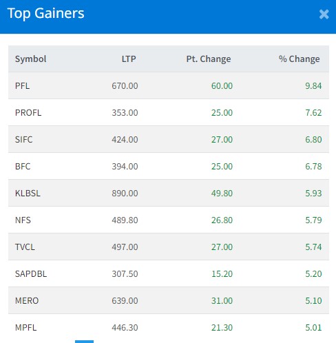 आज सबैभन्दा धेरै पोखरा फाइनान्स कम्पनीका लगानीकर्ताले कमाएका छन् । आज यस कम्पनीका लगानीकर्ताले ९ दशमलव ८४ प्रतिशतका दरले कमाएका छन् । प्रोग्रेशिभ फाइनान्सका लगानीकर्ताले ७ दशमलव ६२ प्रतिशतका दरले कमाएका छन् । श्री इन्भेष्टमेन्ट फाइनान्सका लगानीकर्ताले ६ दशमलव ८० प्रतिशतका दरले कमाएका छन् । वेष्ट फाइनान्सका लगानीकर्ताले ६ दशमलव ७८ प्रतिशतका दरले कमाएका छन् ।