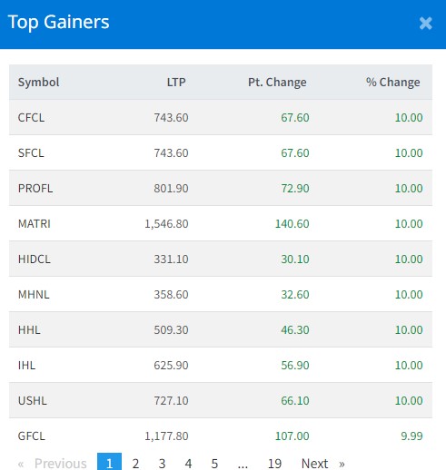 आज सबैभन्दा धेरै ९ वटा कम्पनीका लगानीकर्ताले कमाएका छन् । आज सेन्ट्रल फाइनान्स, समृद्धि फाइनान्स, प्रोग्रेशिभ फाइनान्स, मातृभूमि लघुवित्त, एचआइडीसीएल, माउन्टेन हाइड्रो, हिमालयन हाइड्रो, इङ्वा हाइड्रो र अपर स्याङ्गे हाइड्रोका लगानीकर्ताले १० प्रतिशतका दरले कमाएका छन् ।