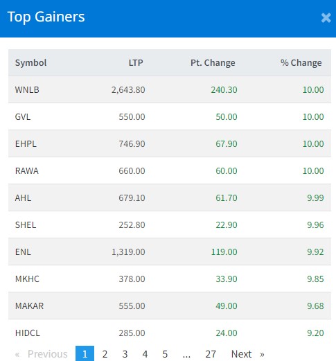 काठमाडौं । आज शेयर बजारमा भारी अंकको बृद्धि भएको छ । आज शेयर बजार नेप्से परिसूचक ७८ दशमलव १७ अंकले बढेर २,६८८ को विन्दुमा कायम भएको छ । आज २२९ कम्पनीको शेयर मूल्य बढेको छ भने १२ कम्पनीको मूल्य घटेको छ । आज सबैभन्दा धेरै विन नेपाल लघुवित्त, ग्रिन भेञ्चर, स्र्टन हाइड्रोपावर र रावा इनर्जीका लगानीकर्ताले कमाएका छन् । आज चार कम्पनीका लगानीकर्ताले १० प्रतिशतका दरले कमाएका छन् ।