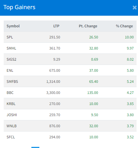 आज सबैभन्दा धेरै शुभम पावर कम्पनीका लगानीकर्ताले कमाएका छन् । यस कम्पनीका लगानीकर्ताले १० प्रतिशतका दरले कमाएका छन् । सुपरमादी हाइड्रापावर कम्पनीका लगानीकर्ताले ९ दशमलव ९७ प्रतिशतका दरले कमाएका छन् । सिद्धार्थ इन्भेष्टमेन्ट ग्रोथ स्किम २ का इकाईधनीले ८ प्रतिशतका दरले कमाएका छन् ।