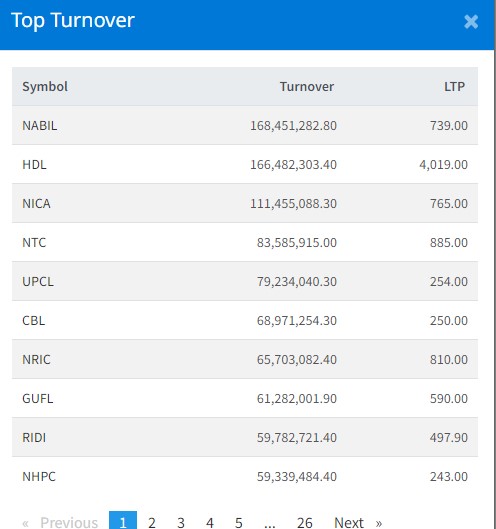 आज सबैभन्दा धेरै नविल बैंकको शेयर कारोबार भएको छ । आज कम्पनीको १६ करोड ८४ लाख रुपैयाँको शेयर कारोबार भएको छ । हिमालयन डिष्टिलरीको १६ करोड ६४ लाख रुपैयाँको शेयर कारोबार भएको छ ।एनआइसी एशिया बैंकको ११ करोड १४ लाख रुपैयाँको शेयर कारोबार भएको छ ।