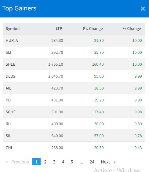 आज २०८ कम्पनीको शेयर मुल्य बढेको छ भने ६ कम्पनीको शेयर मुल्य मात्रै घटेको छ । आज सबैभन्दा धेरै हिमालयन उर्जा विकास, सानिमा लाइफ इन्स्योरेन्स र सिर्जनसिल लघुवित्तका लगानीकर्ताले कमाएका छन् । यी कम्पनीहरुले १० प्रतिशतका दरले कमाएका छन् । धौलागिरी लघुवित्तका लगानकिर्ताले र अजोड इन्स्योरेन्स कम्पनीका लगानीकर्ताले ९ दशमलव ९९ प्रतिशतका दरले कमाएका छन् ।