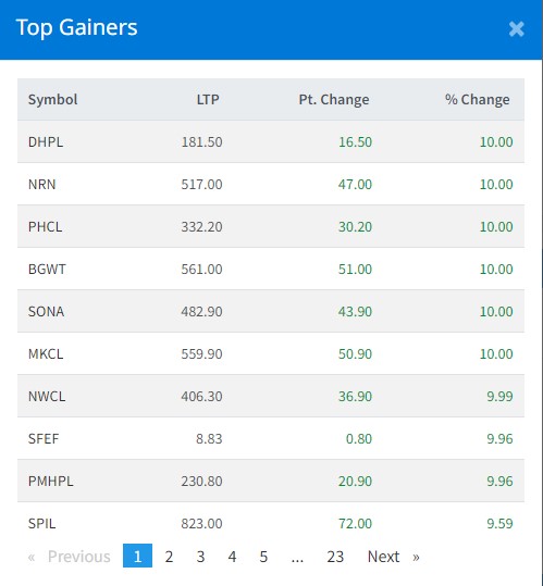 आज सबैभन्दा धेरै ६ कम्पनीका लगानीकर्ताले कमाएका छन् । आज ६ कम्पनीको शेयर मुल्यमा सकारात्मक सर्किट लागेको छ । आज दिव्यश्वरी हाइड्रोपावर, एनआरएन इन्फ्राइट्रक्चर, पिपुल्स हाइड्रोपावर, भगवती हाइड्रोपावर, सोनापुर मिनरल्सका लगानीकर्ताले १० प्रतिशतका दरले कमाएका हुन् ।