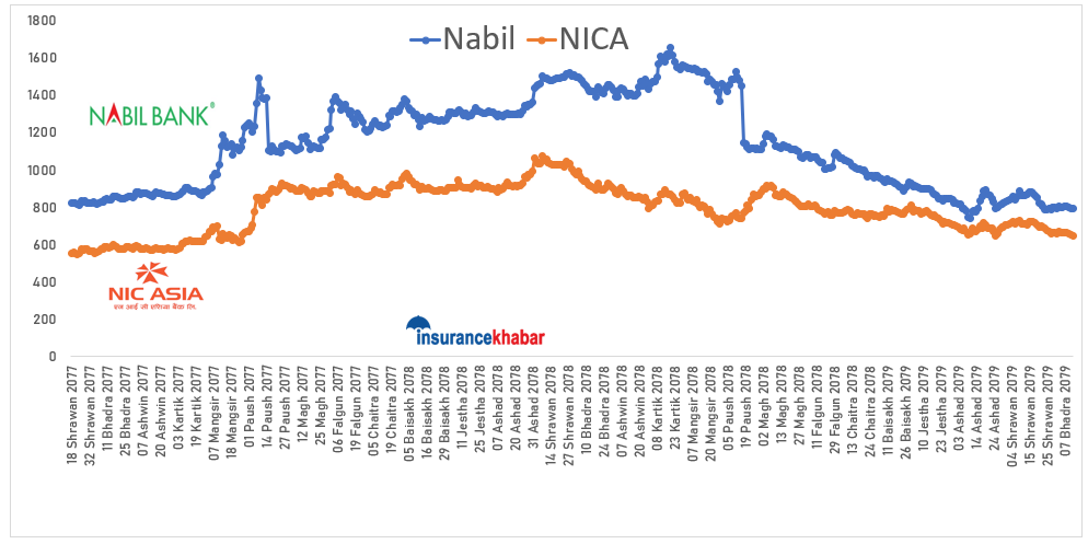 अहिले नबिल बैंकको मूल्य एनआईसी एशियाको भन्दा २२ प्रतिशत धेरै हुँदा यो दुरी १० असार २०७९ मा निकै कम थियो । १० असार २०७९ मा एनआईसी एशियाको शेयर मूल्य ६५९ हुँदा नबिल बैंकको जम्मा ७४० रुपैयाँ थियो ।