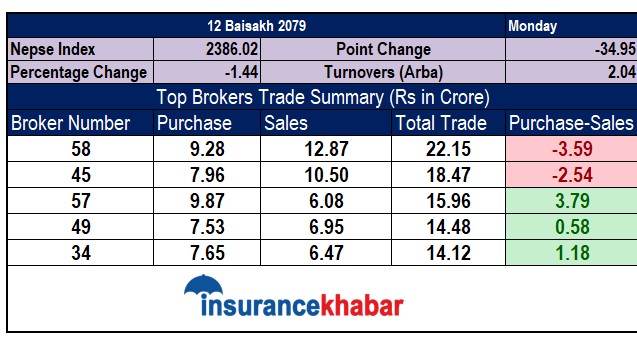 आज ब्रोकर नम्बर ५८ बाट सर्वाधिक शेयर कारोवार भएको छ  । समग्र बजारमा २ अर्ब ४ करोडको कारोवार मध्ये ब्रोकर नम्बर ५८ बाट २२ करोड १५ लाख बराबरको शेयर कारोवार भएको छ । ५८ नम्बर ब्रोकरबाट ९ करोड २८ लाख बराबरको खरिद हुँदा १२ करोड ८७ लाख बराबरको बिक्री भएको छ । उक्त  ब्रोकरबाट खरिद भन्दा ३ करोड ५९ लाख धेरै बिक्री भएको छ।