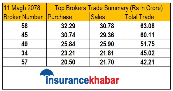 आज सबै भन्दा धेरै कारोवार गरेको ५८ नम्बर ब्रोकरबाट ३२ करोड २९ लाख बराबरको खरिद र ३० करोड ७८ लाख बराबरको बिक्री भएको छ। त्यस्तै ब्रोकर नम्बर ४५ बाट ३० करोड ७४ लाखको खरिद र २९ करोड ३६ लाखको बिक्री भएको छ।