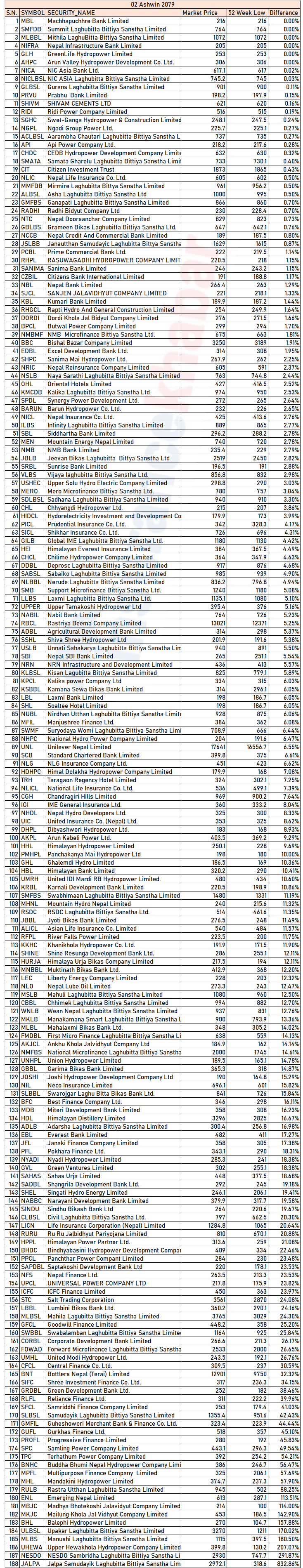 शेयर बजार निरन्तर घटेको कारणले गर्दा अहिले धेरै कम्पनीको शेयर मूल्य ५२ हप्ताको मूल्यको सेरोफेरोमा कारोवार भएका छन् । असोज २ गतेको बजार मूल्यलाई हेर्दा माछापुछ्रे बैंक, समिट लघुवित्त, मिथिला लघुवित्त, निफ्रा, ग्रीनलाइफ हाइड्रो र अरुण हाइड्रो ५२ हप्ताको न्यून विन्दुमै छन् ।