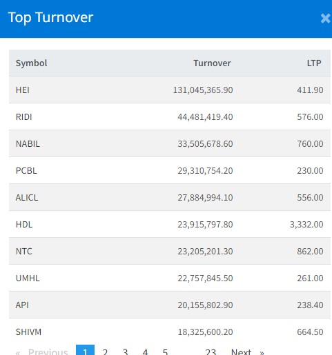 काठमाडौं । आज नेप्से परिसूचक २ दशमलव १३ अंकले घटेर १,९३७ दशमलव ७४ को विन्दुमा कायम भएको छ । १ अर्ब ४ करोड ४४ लाख ४० हजार रुपैयाँको शेयर कारोबार हुँदा हिमालयन एभरेष्ट इन्स्योरेन्सको शेयर कारोबार भएको छ । कम्पनीको १३ करोड १० लाख रुपैयाँको शेयर कारोबार भएको छ । कम्पनीको शेयर मुल्य ४११ रुपैयाँ रहेको छ ।
