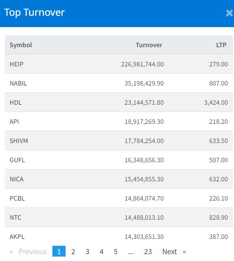 त्यस्तै, नविल बैंकको ३ करोड ५१ लाख रुपैयााको शेयर कारोबार भएको छ । हिमालयन डिष्टलरीको २ करोड ३१ लाख रुपैयाँको शेयर कारोबार भएको छ । अपि पावर कम्पनीको १ करोड ८९ लाख रुपैयाँको शेयर कारोबार भएको छ ।