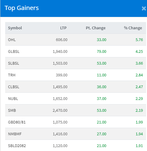 आज सबेभन्दा धेरै ओरिएण्टल होटल्सका लगानीकर्ताले कमाएका छन् । कम्पनीका लगानीकर्ताले ५ दशमलव ६७ प्रतिशतका दरले कमाएका छन् । गुराँस लघुवित्तका लगानीकर्ताले ४ दशमलव २५ प्रतिशतका दरले कमाएका छन् ।