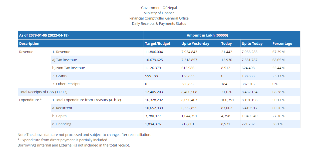 हालसम्म सरकारले ५० प्रतिशत मात्रै खर्च गरेको छ । जवकी आर्थिक वर्ष सकिन अव तीन महिना पनि छैन । चालु खर्च ६०.२६ प्रतिशत मात्रै भएको देखिन्छ । तर पूँजीगत खर्च धेरै नै नाजुक अवस्थामा छ । सरकारले हालसम्म २७.७६ प्रतिशत मात्रै खर्च गरेको छ । त्यस्तै वित्तीय खर्च ३८.१ प्रतिशत मात्रै छ ।