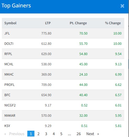 आज सबैभन्दा धेरै जानकी फाइनान्स र दोल्ती पावरका लगानीकर्ताले कमाएका छन् । आज यी २ कम्पनीका लगानीकर्ताले १० प्रतिशतका दरले कमाएका छन् । रिभर फल्स पावरका लगानीकर्ताले ९ दशलमव ५४ प्रतिशतका दरले कमाएका छन् । मेच्छियाम हाइड्रोपावरका लगानीकर्ताले ९ प्रतिशतका दरले कमाएका छन् ।