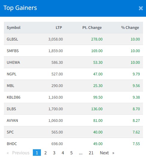 आज सबैभन्दा धेरै गुराँस लघुवित्त, स्वाभिमान लघुवित्त,र अपर हेवाखोला हाइड्रोका लगानीकर्ताले कमाएका छन् । यी ३ कम्पनीका लगानीकर्ताले १० प्रतिशतका दरले कमाएका छन् । ङादी ग्रुप पावरका लगानीकर्ताले ९ दशलमव ९७ प्रतिशतका दरले कमाएका छन् ।