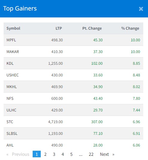 आज सबैभन्दा धेरै मल्टिपर्पस फाइनान्स र मकर जितुमाया हाइड्रोपावरका लगानीकर्ताले कमाएका छन् । आज यी दुई कम्पनीका लगानीकर्ताले १० प्रतिशतका दरले कमाएका छन् । कालिञ्चोक दर्शका लगानीकर्ताले ८ दशलमव ८५ प्रतिशतका दरले कमाएका छन् । अपर सोलुका लगानीकर्ताले ८ दशलमव ४८ प्रतिशतका दरले कमाएका छन् ।