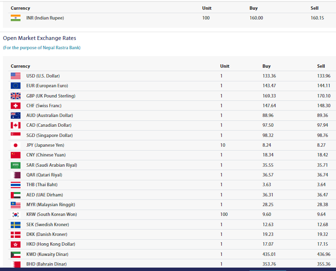 आज युरोपियन युरो एकको खरिदमा भने १४३ रुपैयाँ ४७ पैसा र बिक्रीमा १४४ रुपैयाँ ११ पैसा रहेको छ । बेलायती पाउण्ड स्टर्लिङ एकको खरिददर १६९ रुपैयाँ ३३ पैसा रहेको छ भने बिक्रीदर १७० रुपैयाँ १० पैसा छ ।