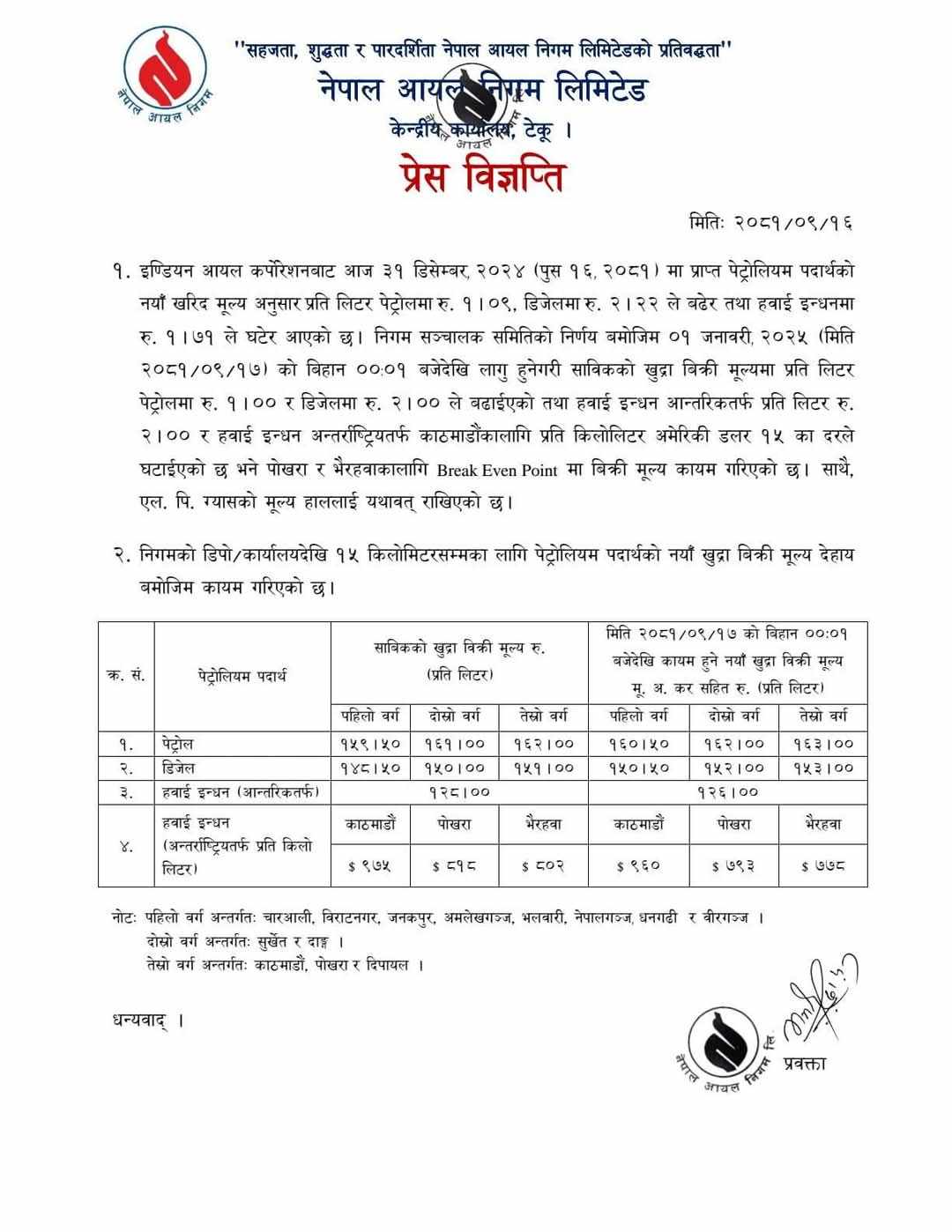 त्यस्तै, हवाई इन्धन आन्तरिकतर्फ प्रतिलिटर २ रुपैयाँ, हवाई इन्धन अन्तराष्ट्रियतर्फ काठमाडौंको लागि प्रति किलोमिटर अमेरिकी डलर १५ का दरले घटाइएको जनाएको छ भने पोखरा र भैरहवाका लागि ब्रेक इभन पोइन्ट मा बिक्री मूल्य कायम गरिएको छ । एलपी ग्यासको मूल्य हाललाई यथावत राखिएको छ ।