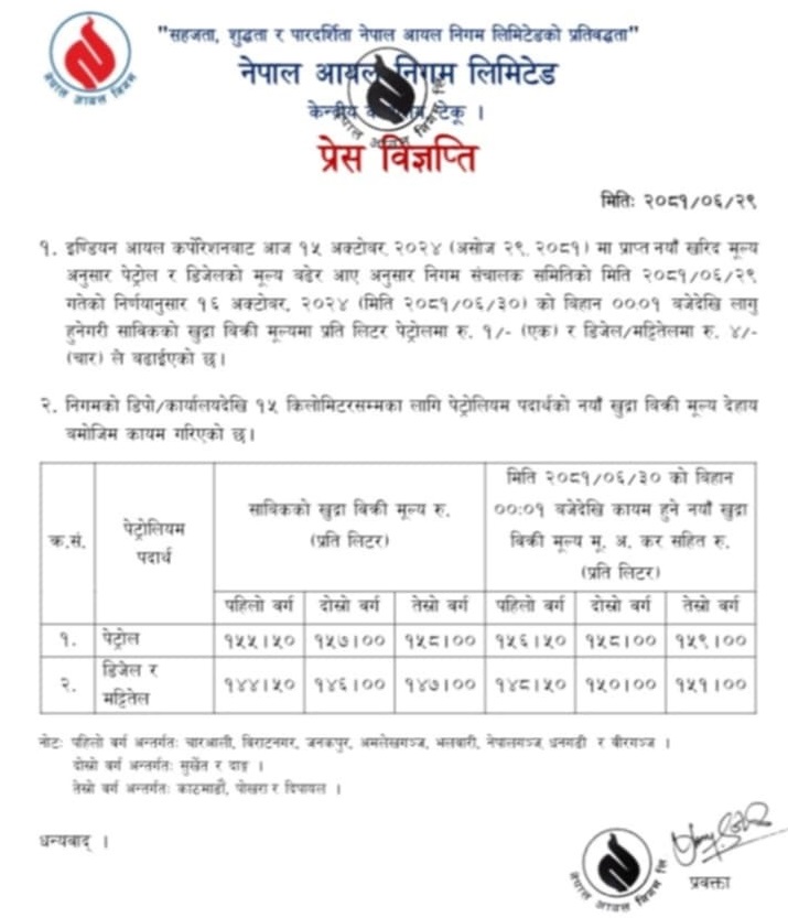 निगमले आज राति १२ बजेदेखि लागू हुने गरी प्रतिलिटर पेट्रोलको मूल्य १ रुपैयाँ तथा डिजेल र मट्टीतेलको मूल्य ४ रुपैयाँको दरले बढाएको हो। भारतले मूल्य बढाएर पठाएसँगै निगमले पनि पेट्रोलियम पदार्थको मूल्य बढाएको हो।