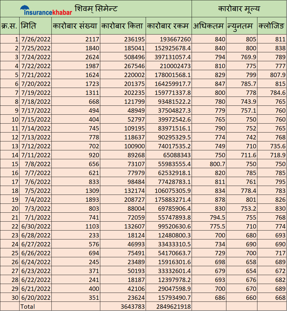काठमाडौं । शिवम् सिमेन्टले यस वर्ष बम्पर बोनस शेयर दिने हल्लै हल्लामा विगत ३० कारोबार दिनमा झण्डै तीन अर्बको कारोबार भएको छ । विगत दुई सातादेखि हरेक दिन दोस्रो बजारमा सर्वाधिक धेरै कारोबार हुने कम्पनीहरुमा पहिलो हुँदै आएको छ । सोही अवधिमा एकै दिन ३९ अर्बसम्म कारोबार भएको छ ।