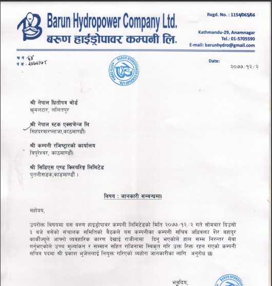 यसअघिका कम्पनी सचिव शेयर बहादुर कार्कीले दिएको राजिनामा स्वीकृत गर्दै कम्पनीले रिक्त पदमा भुजेललाई नियुक्त गरेको कम्पनीले एक सुचना जारी गर्दै जनाएको छ ।