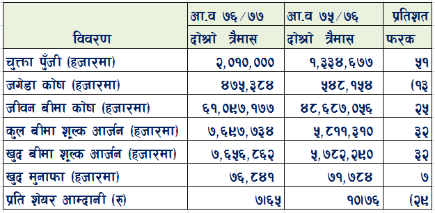 यस अवधिसम्म कम्पनीको बीमालेख संख्या ७ लाख ५१ हजार ५ सय ०३ वटा बीमालेख जारी भएको छ । वार्षिक प्रति शेयर आम्दानी भने ७ रुपैयाँ ६५ पैसा रहेको छ । त्यस्तै किताबी मूल्य १३५ रुपैया ४१ पैसा रहेको छ।
