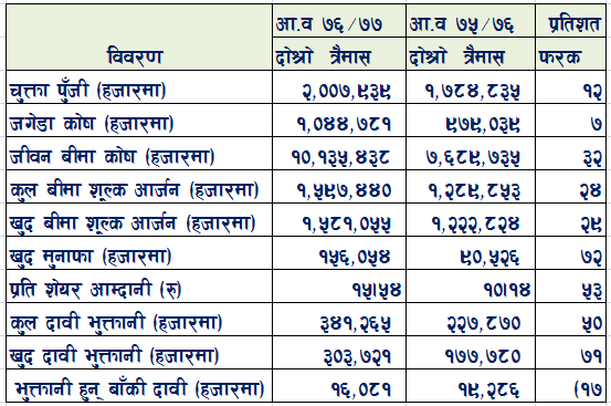 नोट : जीवन बीमा कम्पनीहरुको हकमा भने एक्चुअरी मुल्यांकन हुन बाँकी भएकाले खुद नाफा एक्चुअरी मुल्यांकन पश्चात मात्र वास्तविक आउने छ ।