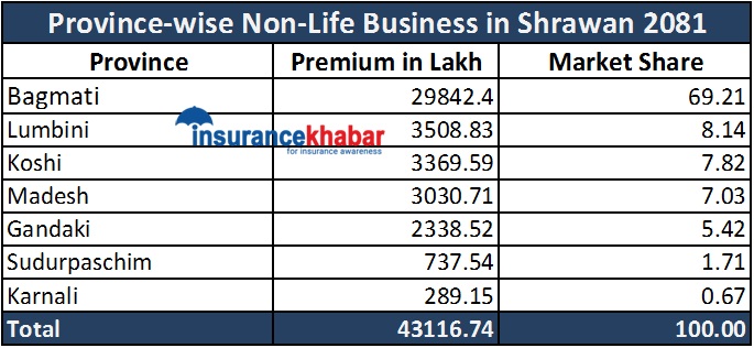 नेपाल बीमा प्राधिकरणले सार्वजनिक गरेको तथ्यांकअनुसार १४ वटा निर्जीवन बीमक र ४ वटा लघु निर्जीवन बीमकले साउनमा ४ अर्ब ३१ करोड १६ लाख रुपैयाँ बढीको व्यापार गरेका हुन्। निर्जीवन बीमकहरुको सबैभन्दा ठूलो बजार बागमती प्रदेशमा देखिएको छ। यो प्रदेशमा निर्जीवन बीमकहरुले २ अर्ब ९८ करोड ४२ लाख रुपैयाँ कुल बीमाशुल्क आर्जन गरेका छन्। यो साउनको कुल व्यापारको ६९.२१ प्रतिशत हिस्सा हो।
