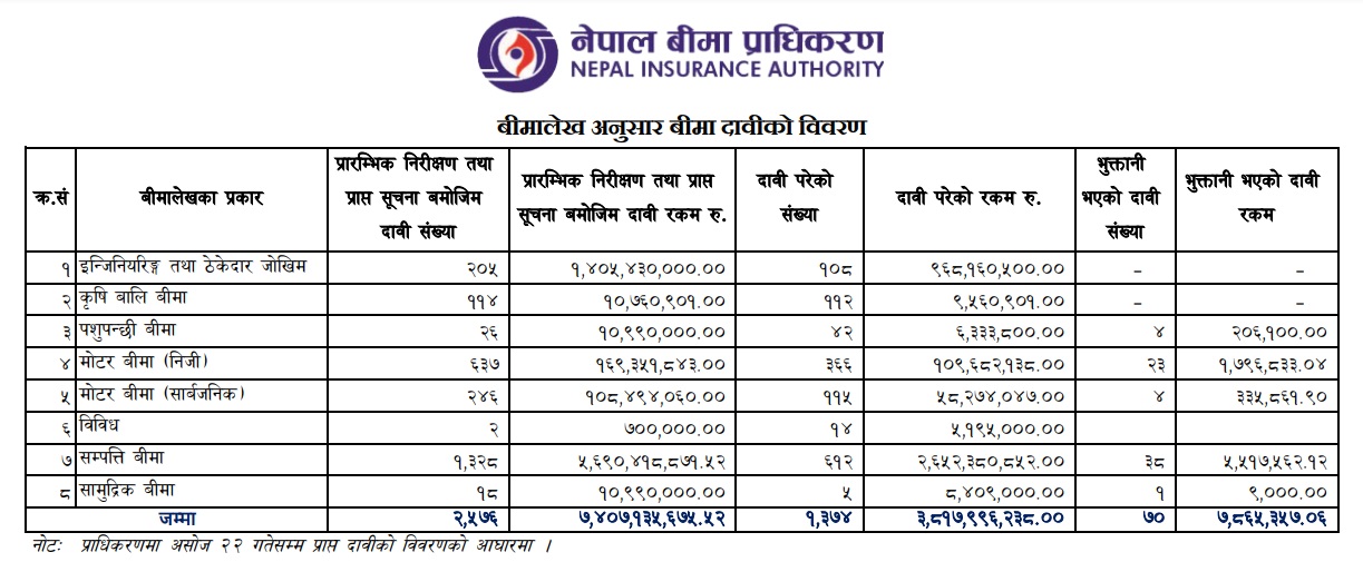प्राधिकरणका अनुसार असोज २२ गतेसम्म बीमा कम्पनीहरुले ७० वटा दाबीको ७८ लाख ६५ हजार ३५७ रुपैयाँ भुक्तानी गरिसकेका छन्।