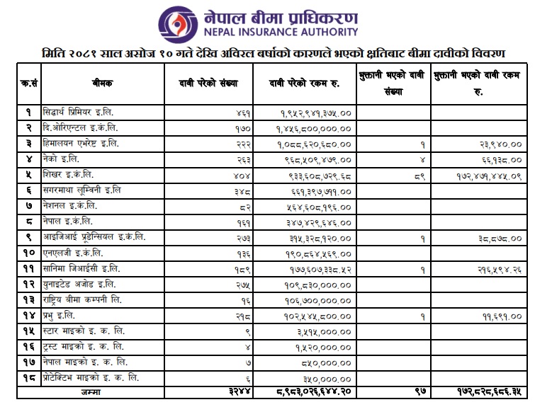 नेपाल बीमा प्राधिकरणका अनुसार असोज २९ गतेसम्म निर्जीवन बीमा र निर्जीवन लघु बीमा गरी १८ वटा कम्पनीमा प्रारम्भिक निरीक्षण तथा प्राप्त सूचनाबमोजिम ३ हजार २४४ वटा दाबी परेको हो। ती दाबीको कम्पनीहरुले ८ अर्ब ९८ करोड ३० लाख २६ हजार ६४४.२० रुपैयाँ भुक्तानी गर्नुपर्नेछ।