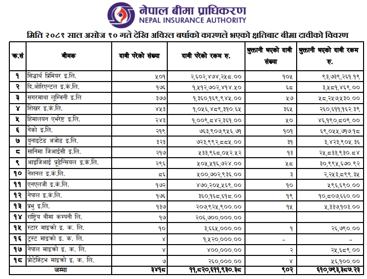 सगरमाथा लुम्बिनीले ३७७ वटा दाबीको १ अर्ब ३६ करोड १ लाख रुपैयाँ, हिमालयन एभरेष्टले २४३ वटा दाबीको १ अर्ब ५ करोड ६४ लाख रुपैयाँ, नेको इन्स्योरेन्सले २१९ वटा दाबीको ७६ करोड ३९ लाख रुपैयाँ, युनाइटेड अजोडले ३२३ वटा दाबीको ७२ करोड ३९ लाख रुपैयाँ र सानिमा जीआईसीले २१७ वटा दाबीको ५३ करोड ३९ लाख रुपैयाँ भुक्तानी गर्नुपर्ने देखिएको छ। हालसम्म सगरमाथा लुम्बिनीले ५७ वटा दाबीको ५ करोड ८२ लाख रुपैयाँ, हिमालयन एभरेष्टले ५० वटा दाबीको ४ करोड ६१ लाख रुपैयाँ, नेको इन्स्योरेन्सले १०१ वटा दाबीको ६ करोड ९० लाख रुपैयाँ, युनाइटेड अजोडले ३१ वटा दाबीको ३४ लाख २३ हजार रुपैयाँ र सानिमा जीआईसीले १३ वटा दाबीको २ करोड ५८ लाख रुपैयाँ भुक्तानी गरेका छन्।