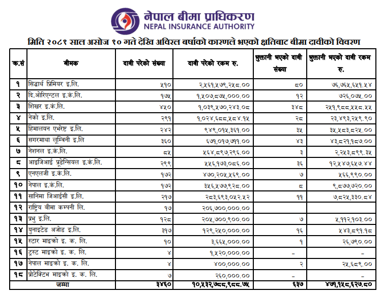 नेको इन्स्योरेन्सले २९१ वटा दाबीको १ अर्ब २ करोड ४६ लाख ८८ हजार रुपैयाँ, हिमालयन एभरेष्टले २४२ वटा दाबीको ९४ करोड ९० लाख १५ हजार रुपैयाँ, सगरमाथा लुम्बिनीले ३६० वटा दाबीको ६७ करोड १० लाख १७ हजार रुपैयाँ, नेसनल इन्स्योरेन्सले ८५ वटा दाबीको ५६ करोड ४८ लाख ९७ हजार रुपैयाँ, आईजीआई प्रुडेन्सियल इन्स्योरेन्सले २९९ वटा दाबीको ५५ करोड ६१ लाख ७३ हजार रुपैयाँ र एनएलजी इन्स्योरेन्सले १७२ वटा दाबीको ४७ करोड २ लाख ५ हजार रुपैयाँ भुक्तानी गर्नुपर्ने देखिएको छ।