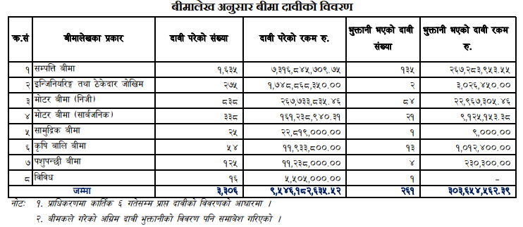 सामुद्रिक बीमातर्फ कम्पनीहरुमा २५ वटा दाबी (२ करोड २८ लाख १९ हजार रुपैयाँ), कृषि बाली बीमातर्फ ५४ वटा दाबी (१ करोड १९ लाख ३३ हजार रुपैयाँ), पशुपन्छी बीमातर्फ १२५ दाबी (१ करोड १२ लाख ३८ हजार रुपैयाँ) र विविधतर्फ १६ वटा दाबी (५५ लाख ५ हजार रुपैयाँ) परेका छन्।
