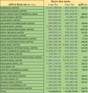 राष्ट्रिय बाणिज्य बैंकको पनि वितरण योग्य मुनाफा तीन अर्ब चार करोड रुपैयाँ छ । यस वर्ष ग्लोबल आइएमई बैंकको पनि वितरण योग्य मुनाफा दुई अर्ब ५६ करोड रुपैयाँ छ । प्राइम कमर्सियल बैंकको दुई अर्ब २० करोड रुपैयाँ, एनएमबी बैंकको दुई अर्ब २७ करोड रुपैयाँ छ।