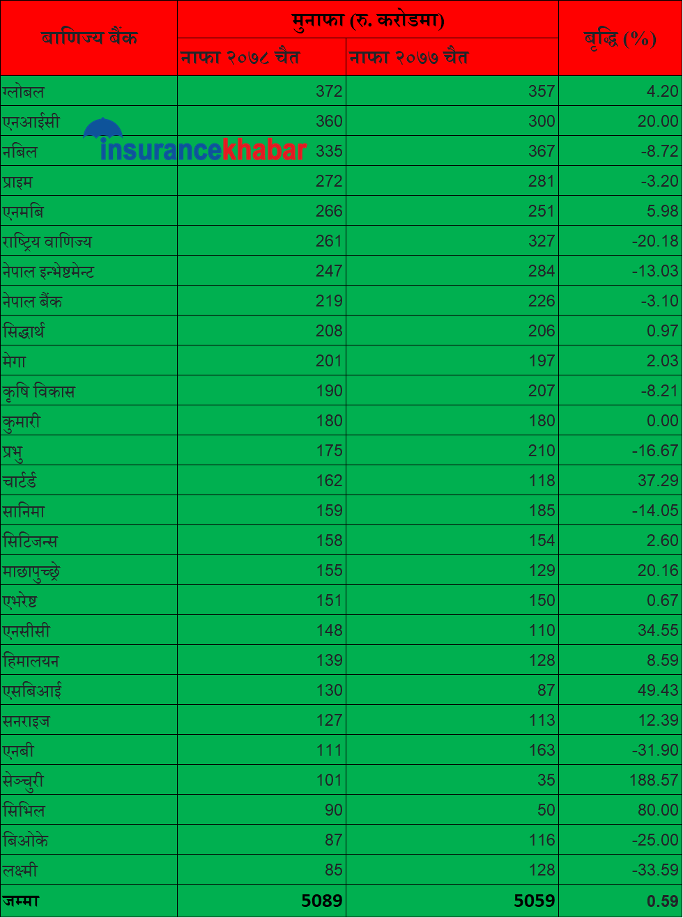 काठमाडौं । राष्ट्रिय स्तरका बाणिज्य बैंकहरुले चालु आर्थिक वर्ष २०७८/७९ को तेस्रो त्रैमाशिक अवधिमा ५० अर्ब ८९ करोड रुपैयाँ मुनाफा आर्जन गरेका छन् । गत आर्थिक वर्षको तुलनामा बाणिज्य बैंकहरुको मुनाफामा भने खासै सुधार हुन सकेन । यस अवधिमा जम्मा ०.५९ प्रतिशतको मात्रै सुधार देखिएको छ । गत वर्षको यहि अवधिमा बैंकहरुले ५० अर्ब ५९ करोड रुपैयाँ मुनाफा आर्जन गरेका थिए ।