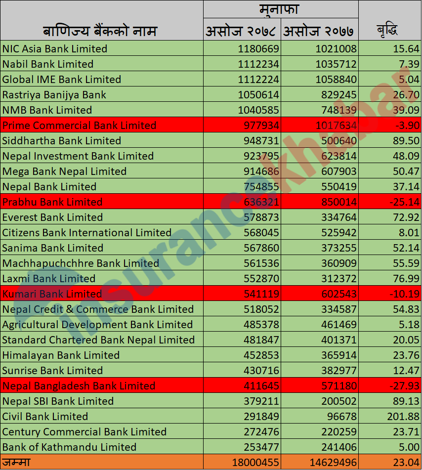 समग्र बैंकिङ क्षेत्रको मुनाफा २३ प्रतिशतले बृद्धि हुँदा नेपाल बंगलादेश बैंकको भने २७ प्रतिशतले घटेको छ । शेयर बिक्री गरेर गत वर्ष नाफा देखाएको बैंकले यस वर्ष भने खासै नाफा गर्न सकेन । मुनाफा २७ प्रतिशतले घटेर ४१ करोड १६ लाख रुपैयाँमा समिति भएको छ । प्रभु बैंकको पनि यस वर्ष २५ प्रतिशतले मुनाफामा गिरावट देखिएको छ । यस वर्ष कुमारी र प्राइम कमर्सियल बैंकको मुनाफामा पनि राम्रो गिरावट आएको देखिन्छ । यस वर्ष कमजोर देखिएका बैंकहरुले राम्रो नाफा गरेका छन् भने बलिया भनिएका बैंकहरुको भने खासै सुधार देखिदैन ।
