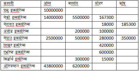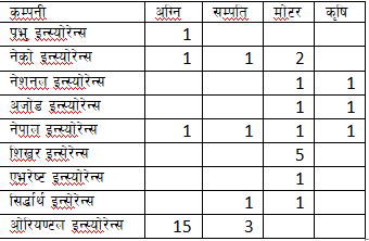 बीमा समितिको तथ्यांक अनुसार ओरियण्टल इन्स्योरेन्स कम्पनीमा सबैभन्दा धेरै १८ वटा बीमा दावी परेको छ । जस बापत बीमितले ५ करोड रुपैयाँ बारबरको बिमा दाबी गरेका छन् । त्यस्तै, नेको इन्स्यारेन्स कम्पनीमा सात वटा दाबी परेको छ । जस बापत १ करोड ९६ लाख रुपैयाँ बराबरको बिमा रकम दाबी परेको छ । नेको कम्पनीमा परेको कुल दाबी संख्यामध्ये तीन वटा दाबीको भने विववरण नै आएको छैन ।
